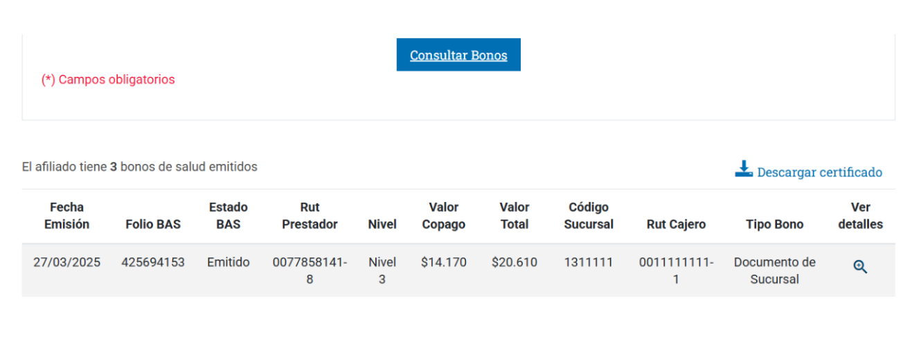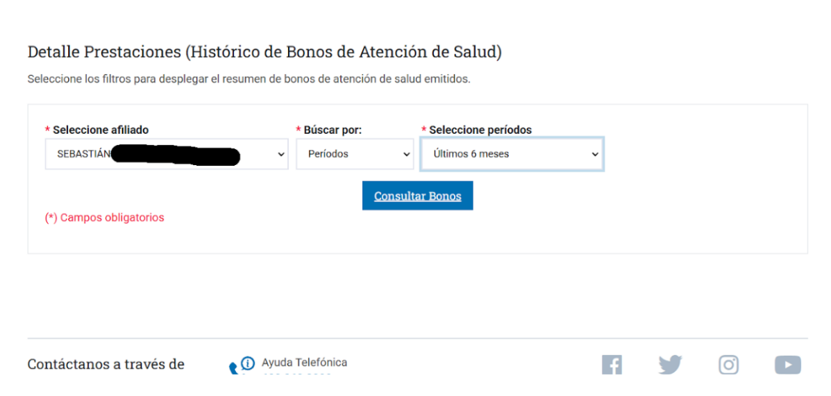 Cuando ingreses a esa sección, solo tienes que poner el afiliado y el periodo. Luego de hacer la consulta, verás los últimos bonos comprados. Envíanos el número de folio al WhatsApp +56 9 2885 3270