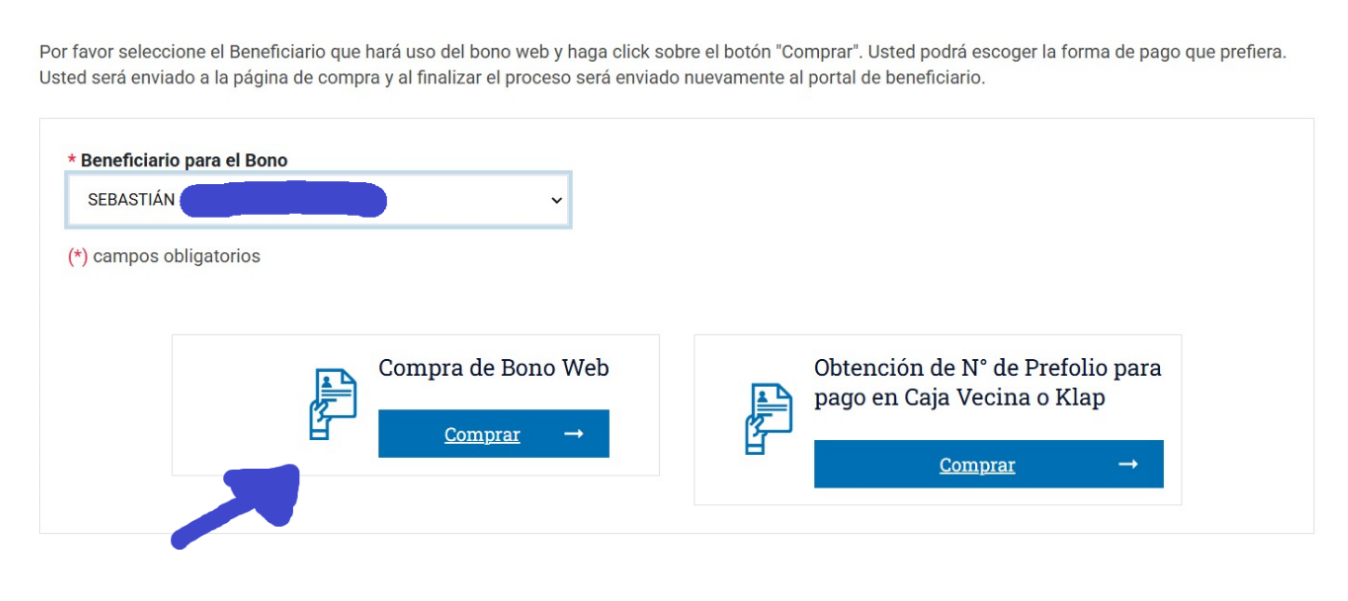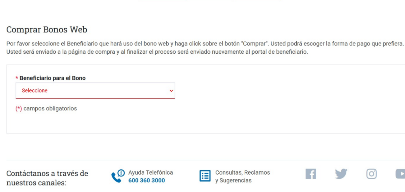 Luego de hacer clic en “Comprar Bono”, ingresarás a una sección donde debes seleccionar a quién va dirigido el bono. Verás tu nombre en el menú desplegable y, si tienes hijos como cargas familiares, también aparecerán allí. Debes elegir tu nombre para continuar.