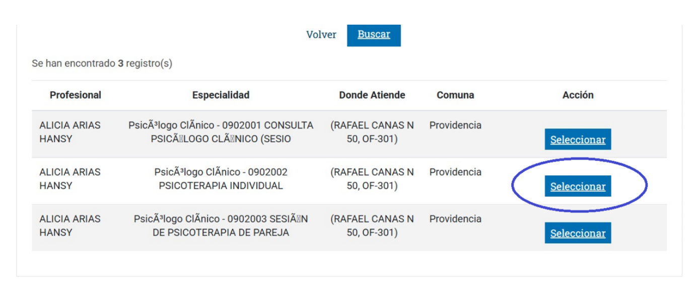 Una vez que hayas ingresado el Rut y el código de prestación, haz clic en “Buscar”. Aparecerán los datos de la psicóloga. Al ver esta ventana, selecciona “Seleccionar”, y se abrirá una ventana emergente como la que se muestra en la imagen.